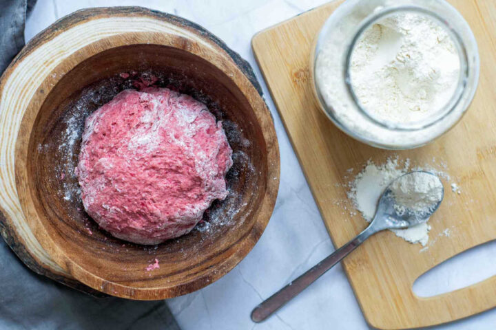- Combine the flour, eggs, olive oil, salt, and grated beetroot in a bowl. Knead the mixture until it forms a smooth, elastic dough.