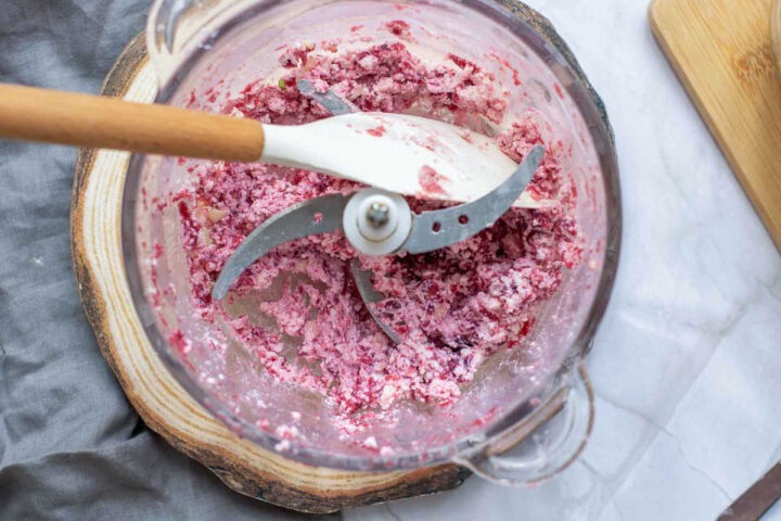 - In a blender or food processor, blend the roasted beets, goat cheese, minced garlic, salt, and pepper until smooth. Adjust seasoning to taste.