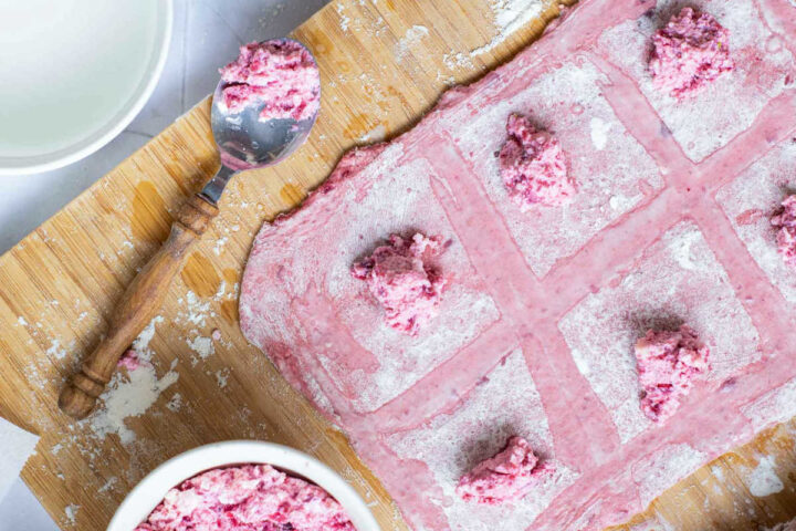 - Place small dollops of the beet and goat cheese mixture onto one pasta sheet, leaving space between each dollop. Brush the edges with a bit of water to ensure they remain sealed while cooking.