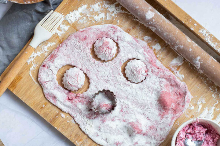 Step 3: Roll out the pasta dough into thin sheets using a pasta machine or a rolling pin. Brush the edges with a bit of water to ensure they remain sealed while cooking. Place small dollops of the beet and goat cheese mixture onto one pasta sheet, leaving space between each dollop.