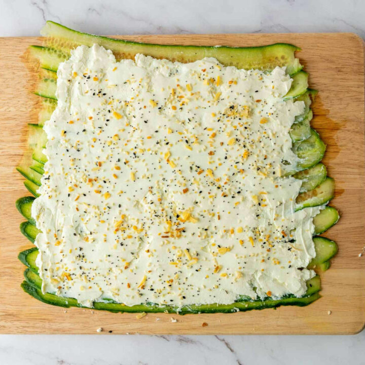 - Spread the softened cream cheese evenly over the cucumber ribbons, then sprinkle with everything bagel seasoning and fresh dill.